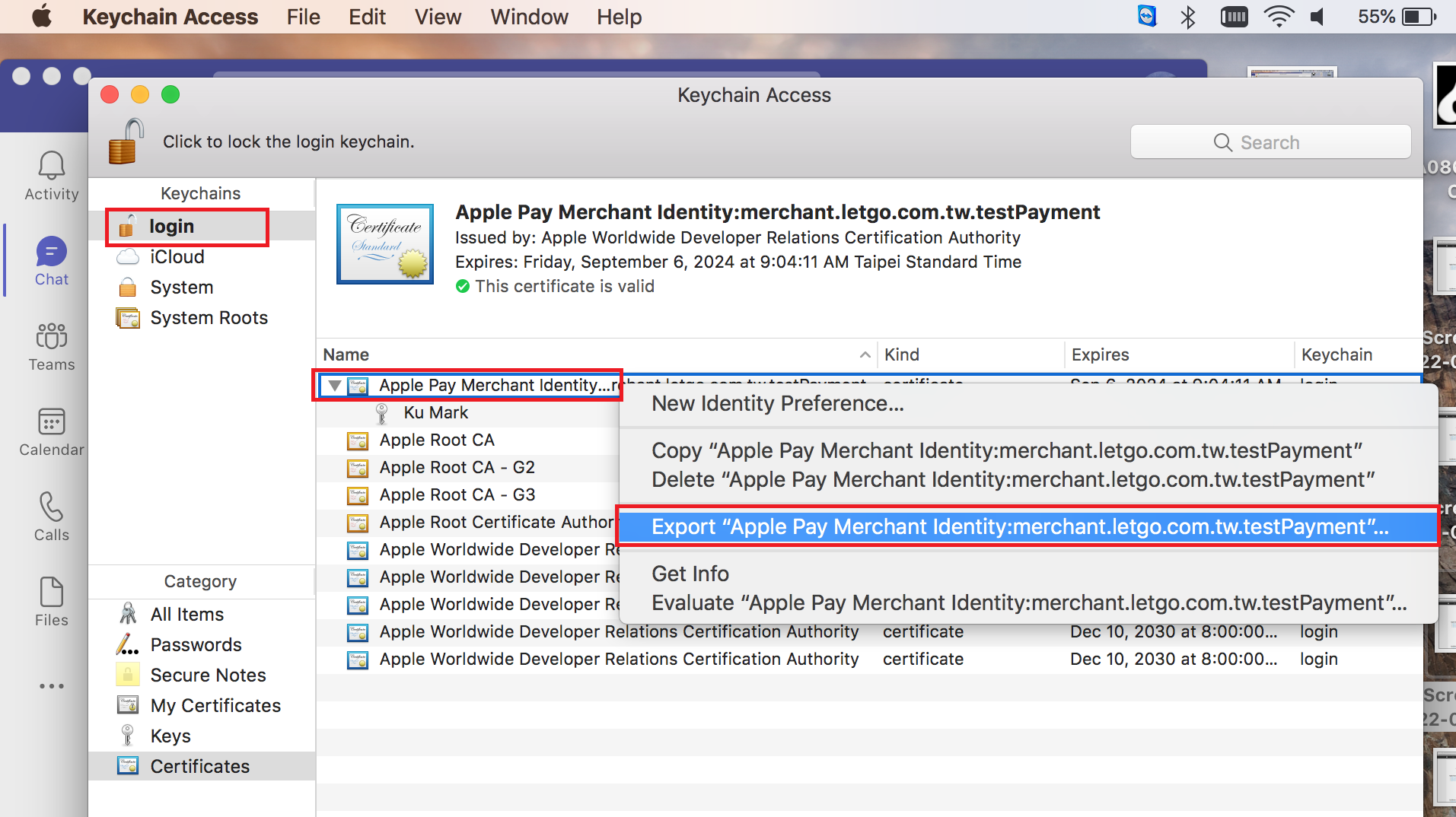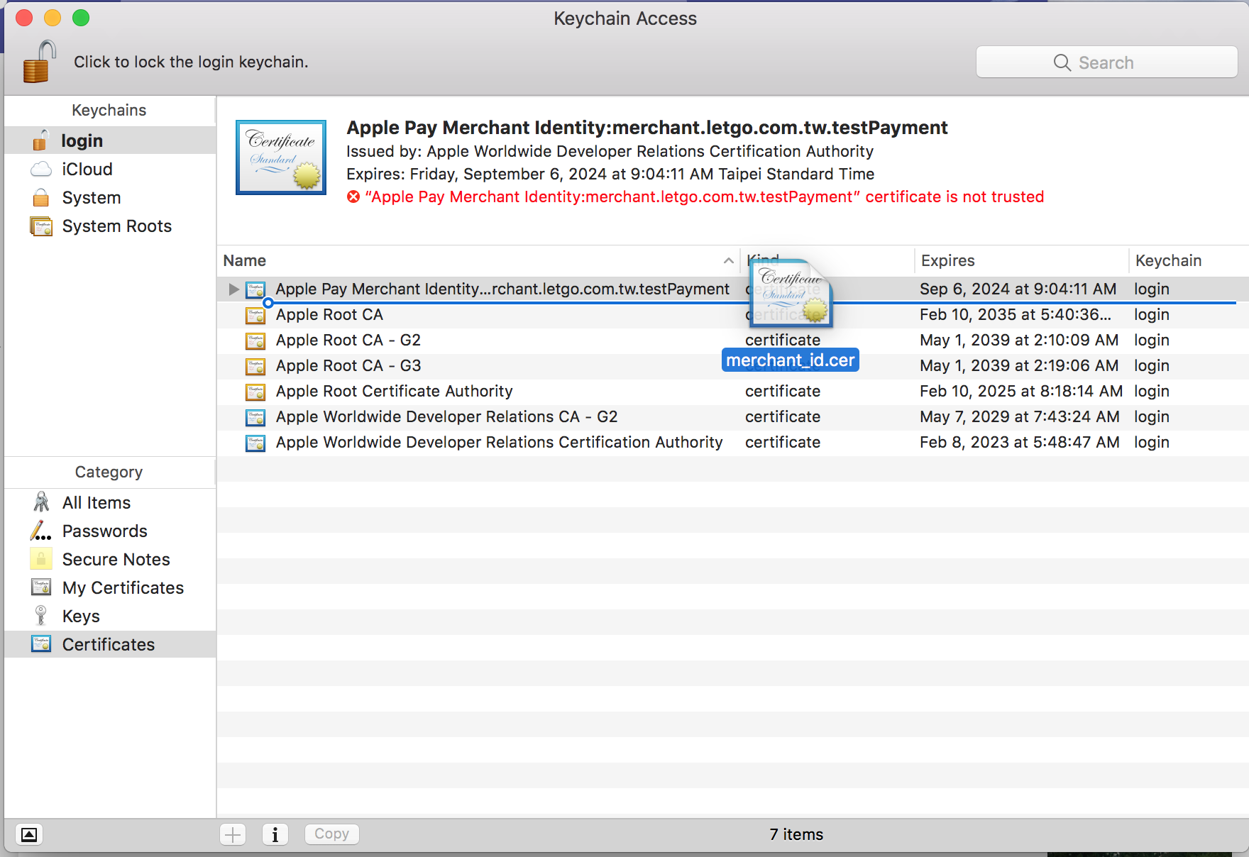 將下載下來的 cer 拖進 Keychain Access 的 login, 剛拖進來會發現憑證是 certificate is not trusted。