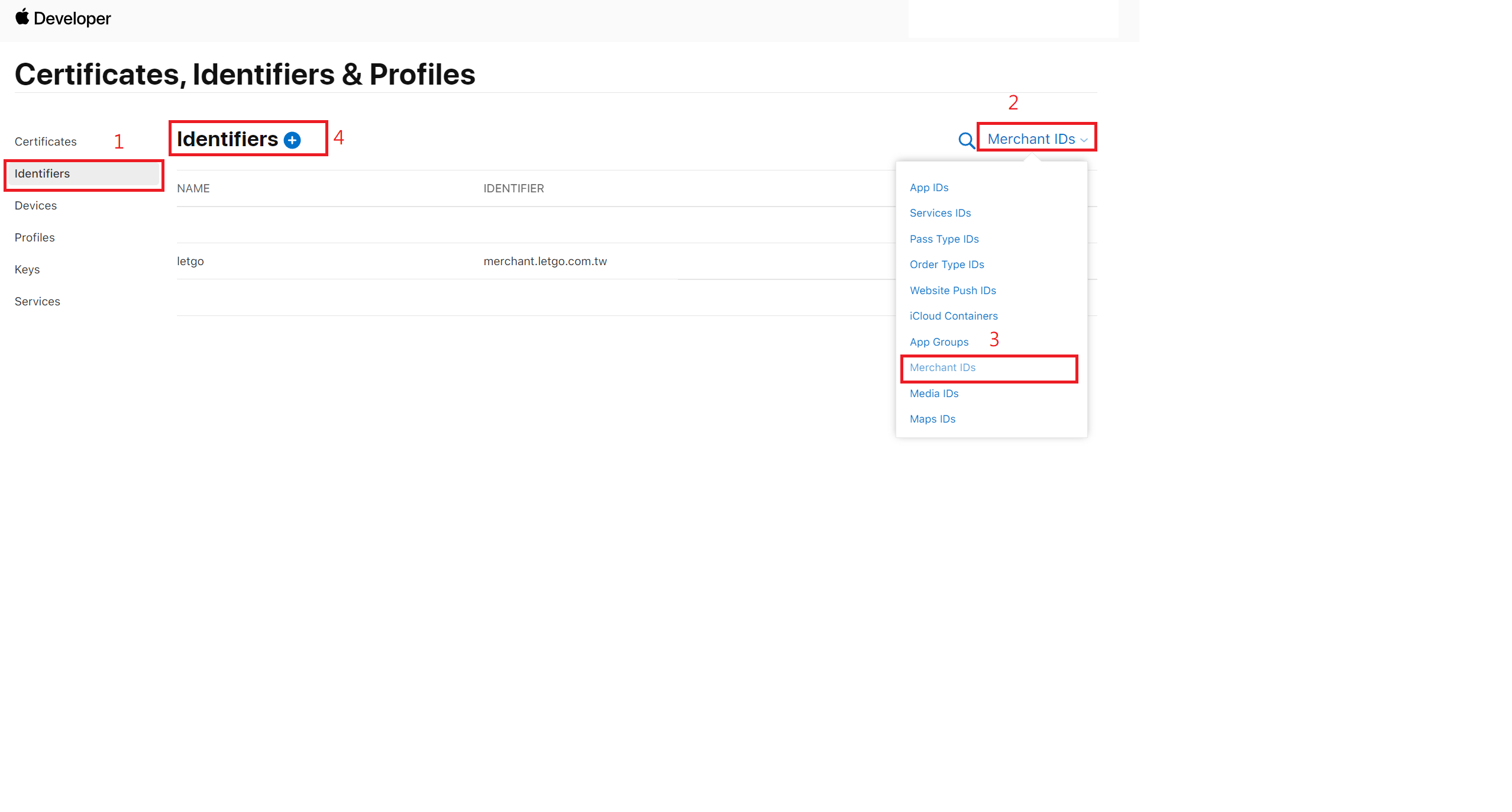 Identifiers > App IDs > Merchant IDs > Identifiers +