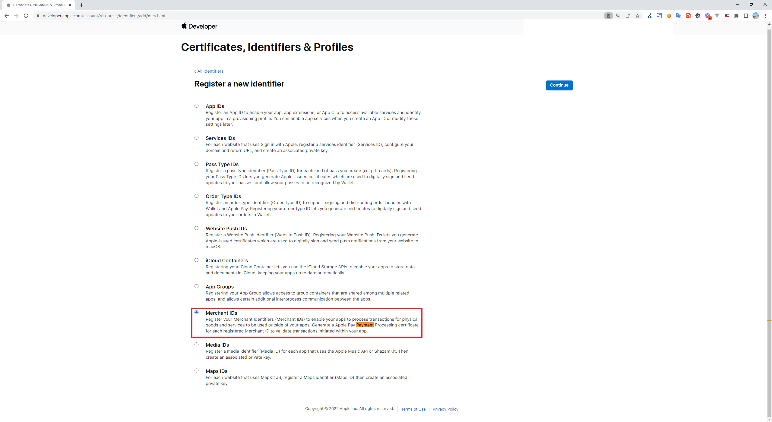 Merchant IDs > Continue
