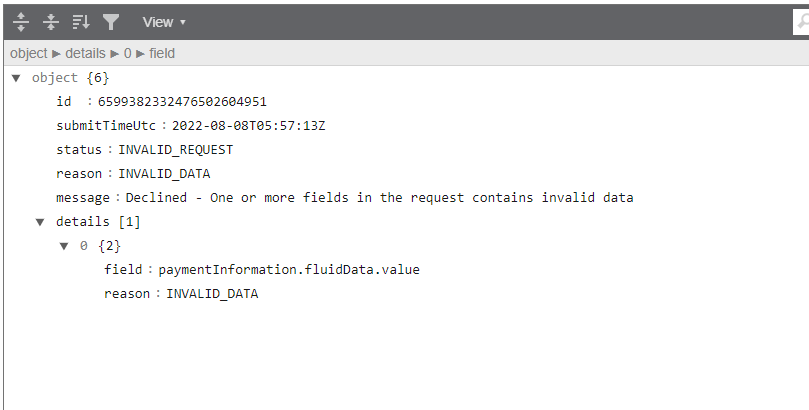 和 Cybersource 建立訂單時,出現 Invalid_Request,並指定paymentInformation.fluidData.value 欄位錯誤