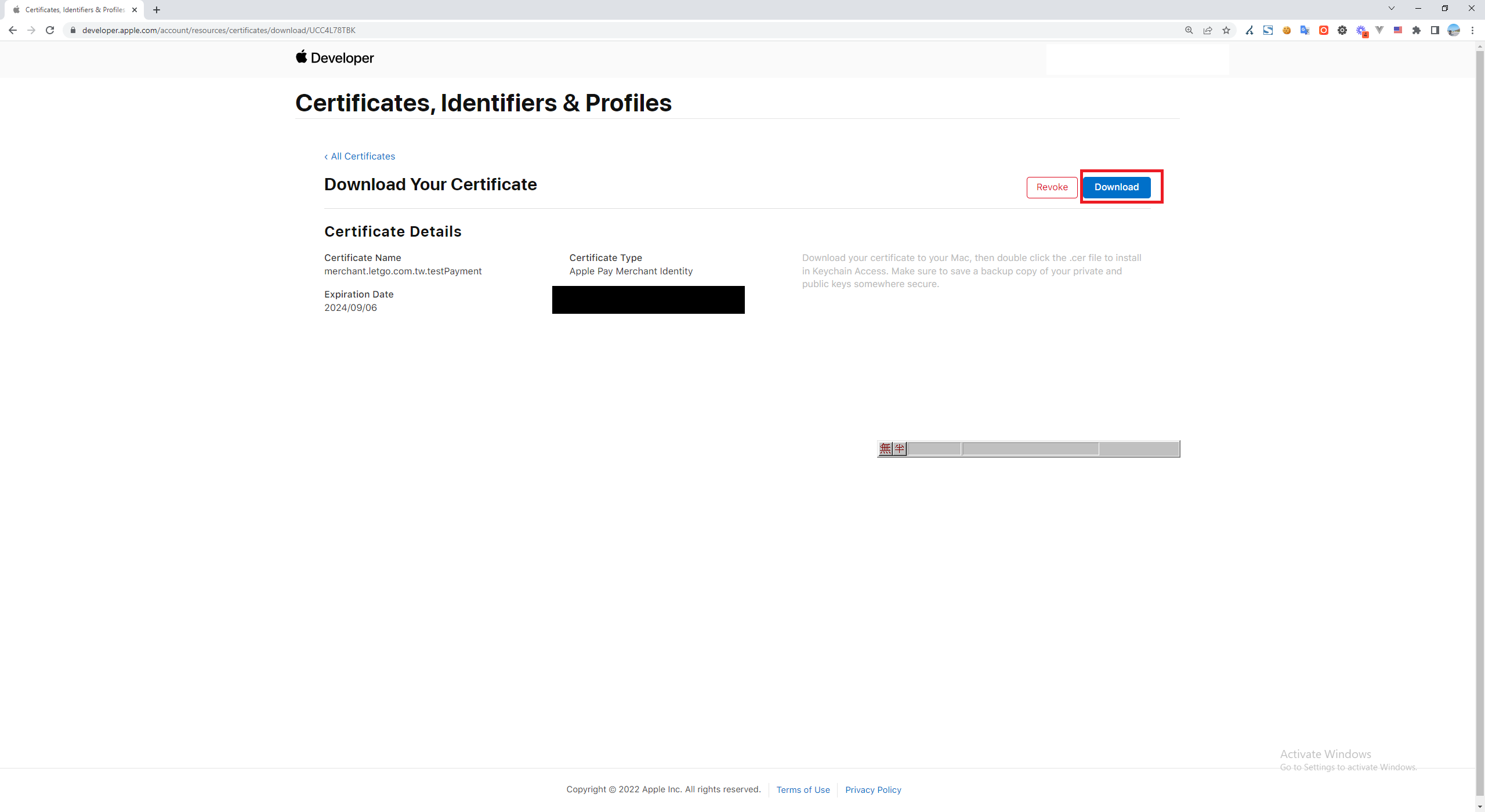 5.上傳完後會有個 Download,按下後會將憑證下載至電腦,之後商戶驗證時和蘋果發出請求需要憑證,但 NET x509 元件無法使用 Cer,因此要透過 Apple 電腦轉成 p12 檔。