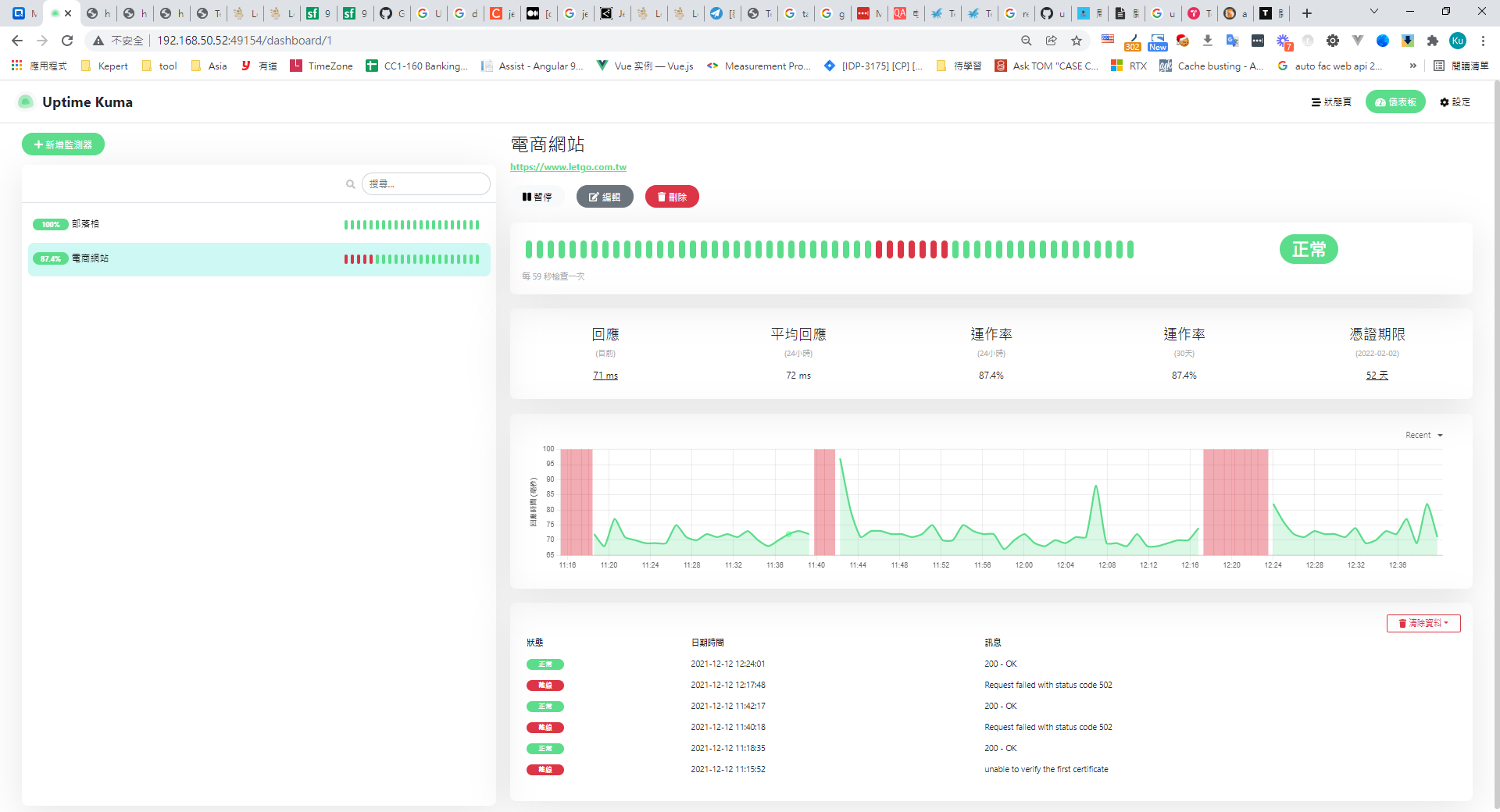7. 在模擬網站掛了時發現,僅會通知一次,並不支援重覆通知,不過看了看原始碼是 node js 及 vue ,應該是能輕易的自己擴充。