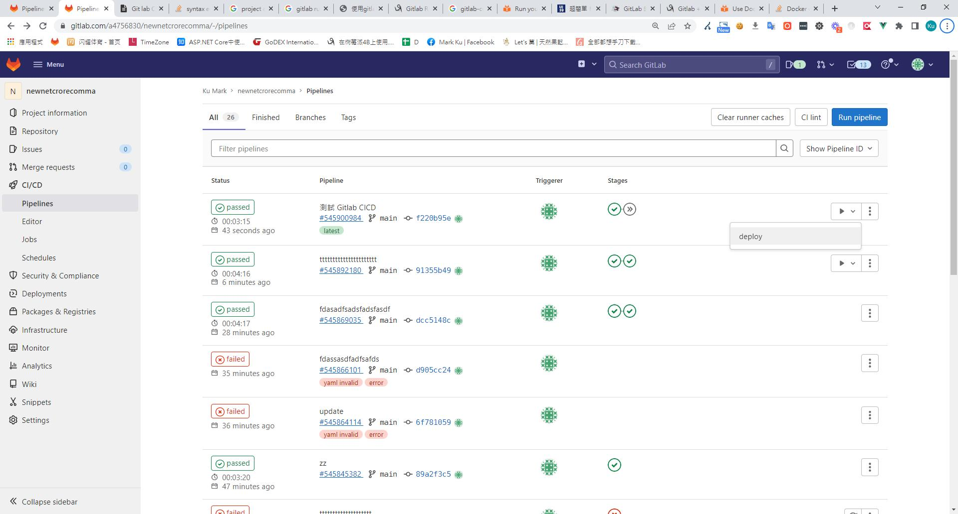 9. gitlab-ci.yml 是 gitlab piplines 設定檔,專案根目錄加入 .gitlab-ci.yml 檔案,則符合條件就會執行相關的 stages 的指令。