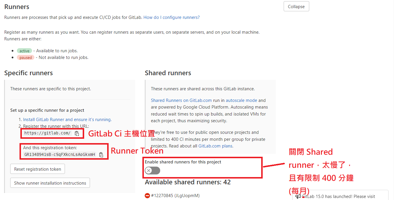 4. 在下面,我們可以 Runners > Expand > 關閉 Shared Runner,並複製 Gitlab CI url 及 token 起來,給地端的 Runner 註冊。