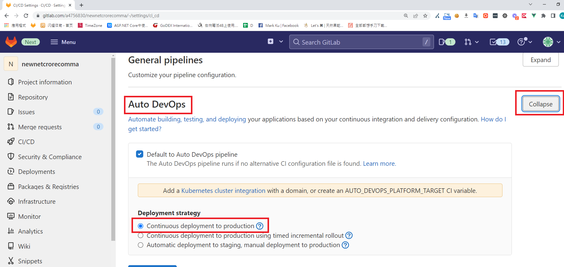 3. 接著找到 Auto DevOps > Expand > 勾選 Continuous deployment to production > Save changes