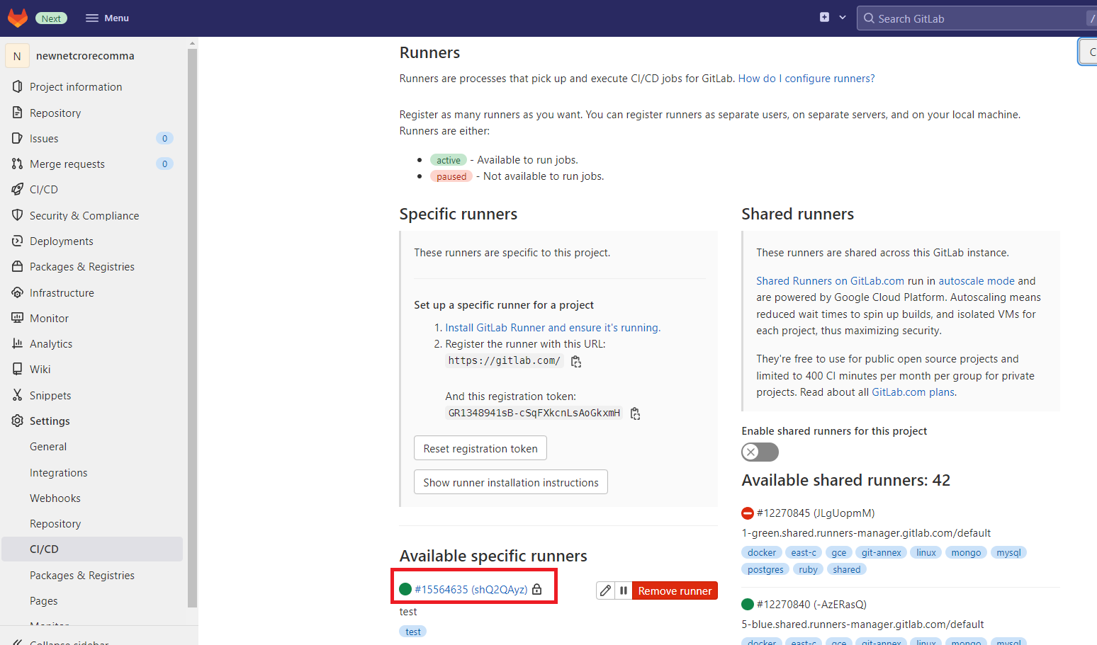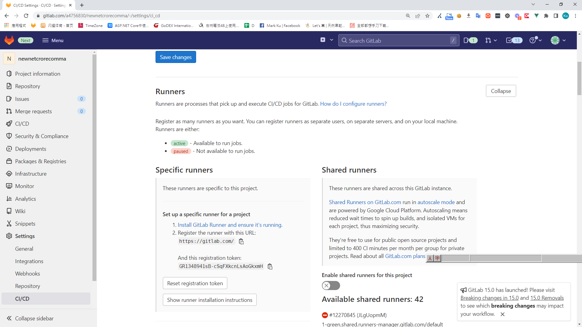 8. 當 Runner 起動後,此時 Gitlab 後台設定就會發現多了一個 Active 的 Runner,可以使用
