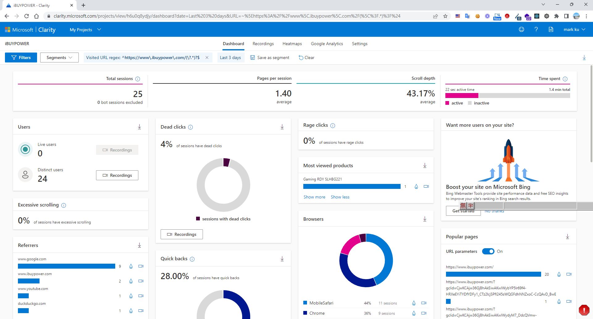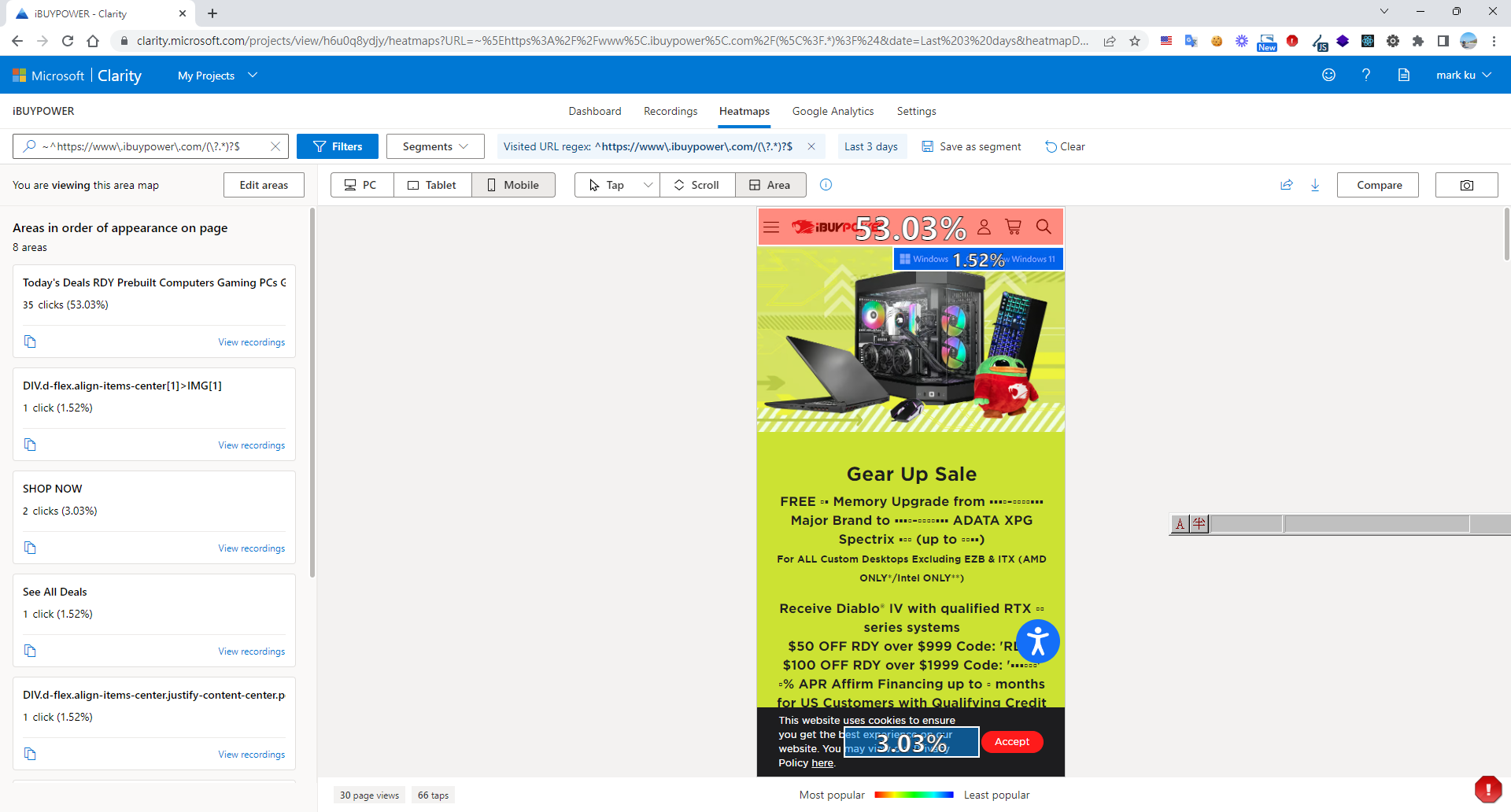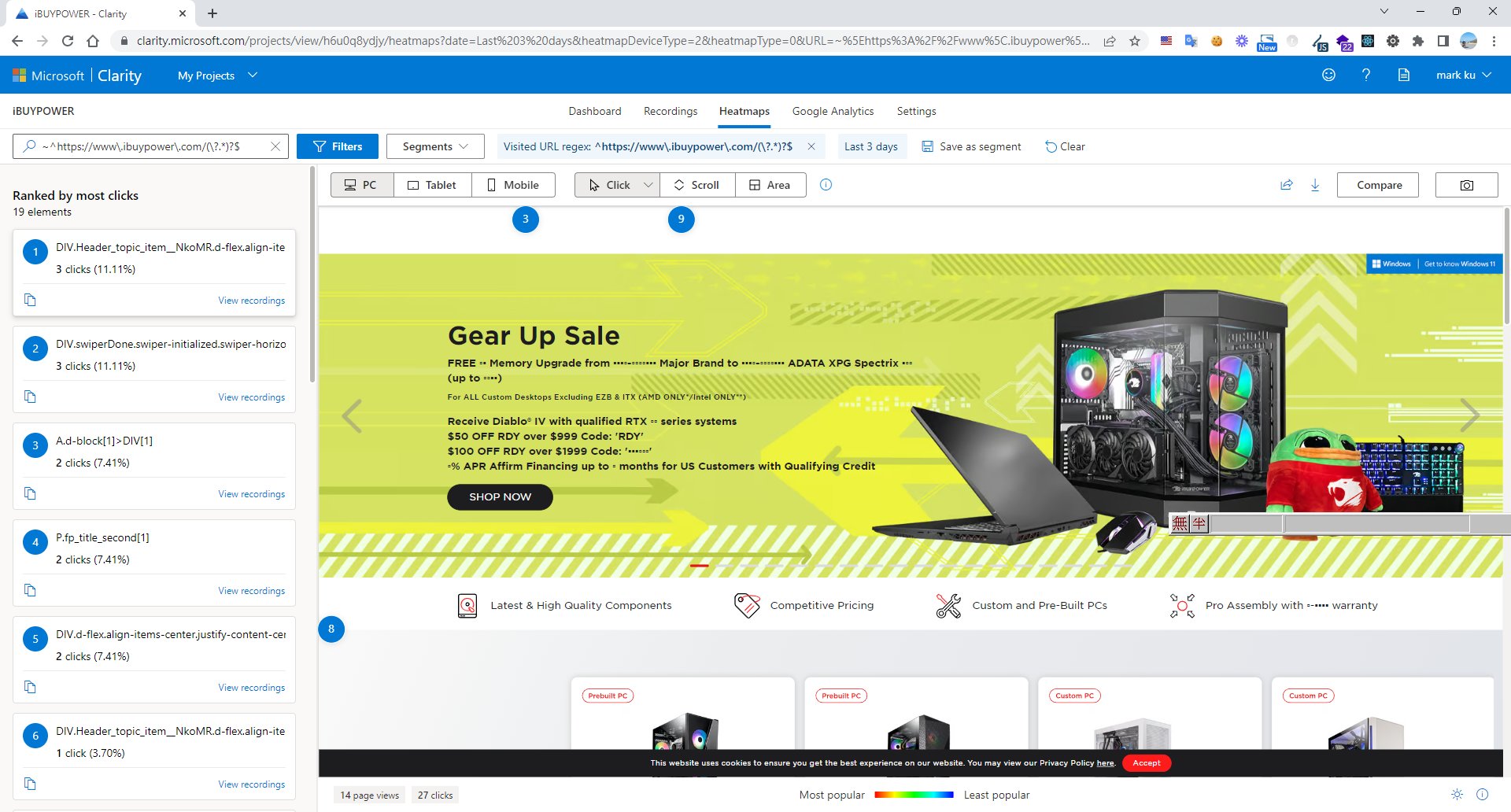 Heatmaps: Clarity 的熱點圖讓你看見用戶在頁面上最常點擊和滾動的位置,這可以幫助你更好地了解哪些內容最吸引人,以及你的網站設計是否符合用戶期望。