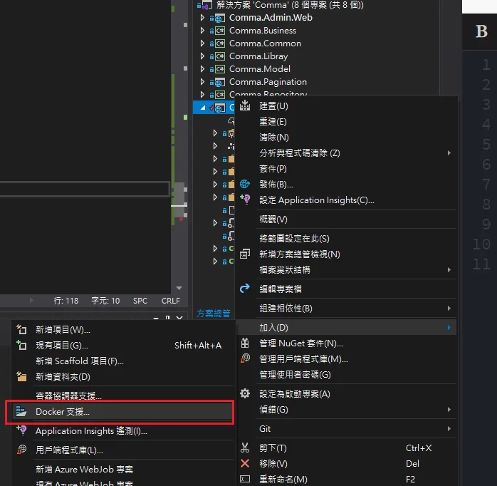 首先開啟 Visual Studio ,對要佈署的專案右鍵 > 加入 > 容器化支援(此時就會在 該專案檔目錄產生一個 DockerFile)