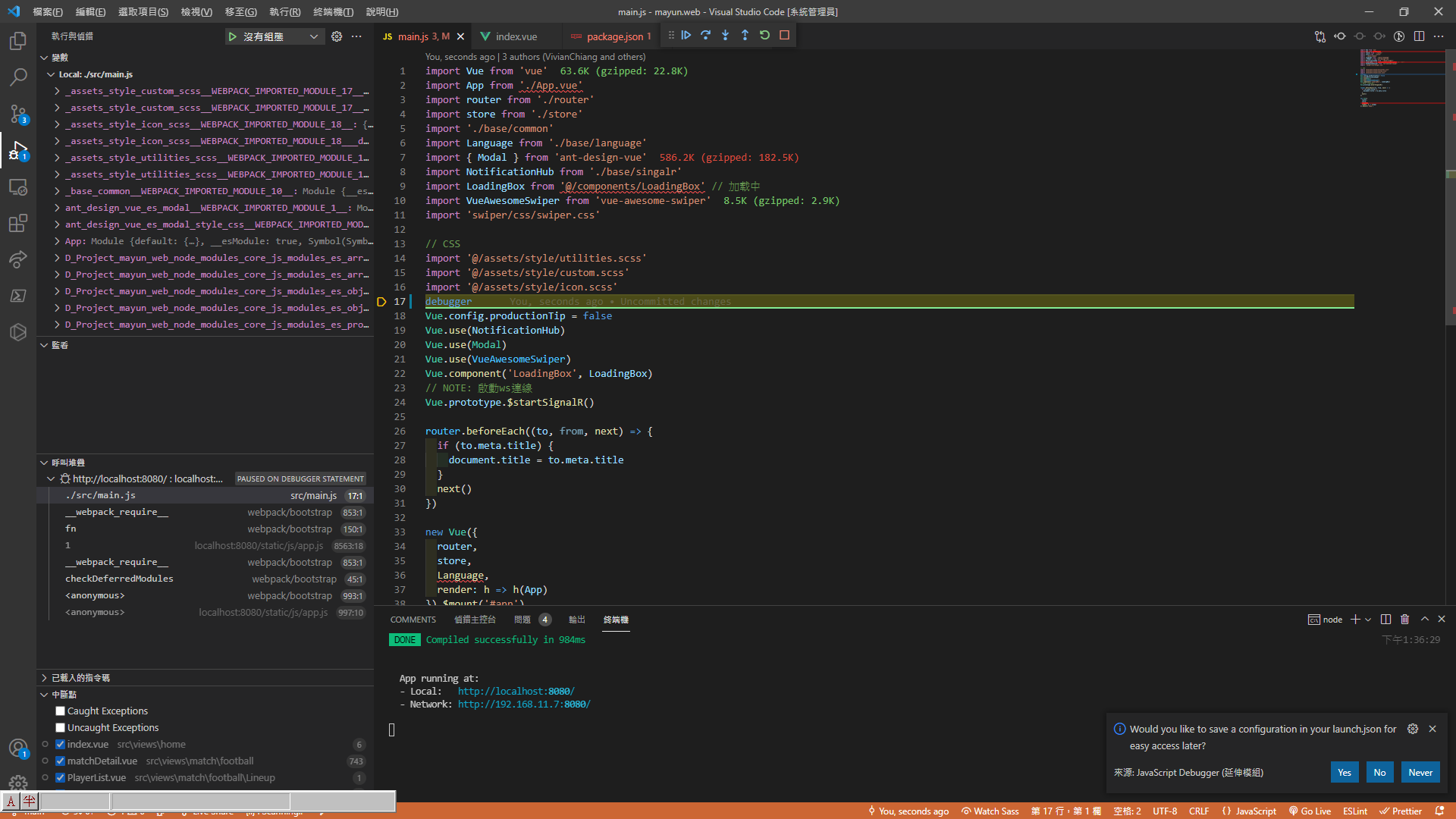 此時中斷點就會停在 main.js