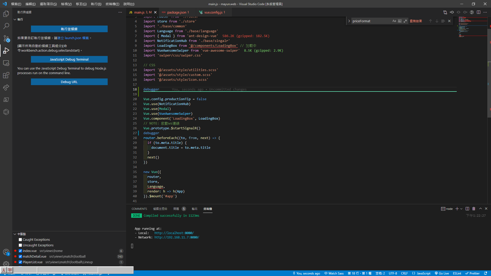 1. 在 main.js 加入宣告除錯功能 ( debugger )