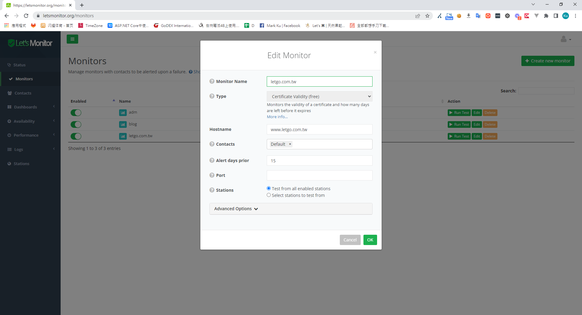 除了先前文章所提到的 uptime-kuma 可以在憑證失效的 7天、14天、21天憑證過期前會提醒。此外 LetsMonitor 也提供免費 SSL 憑證到期提醒與監測,可以當個備案。