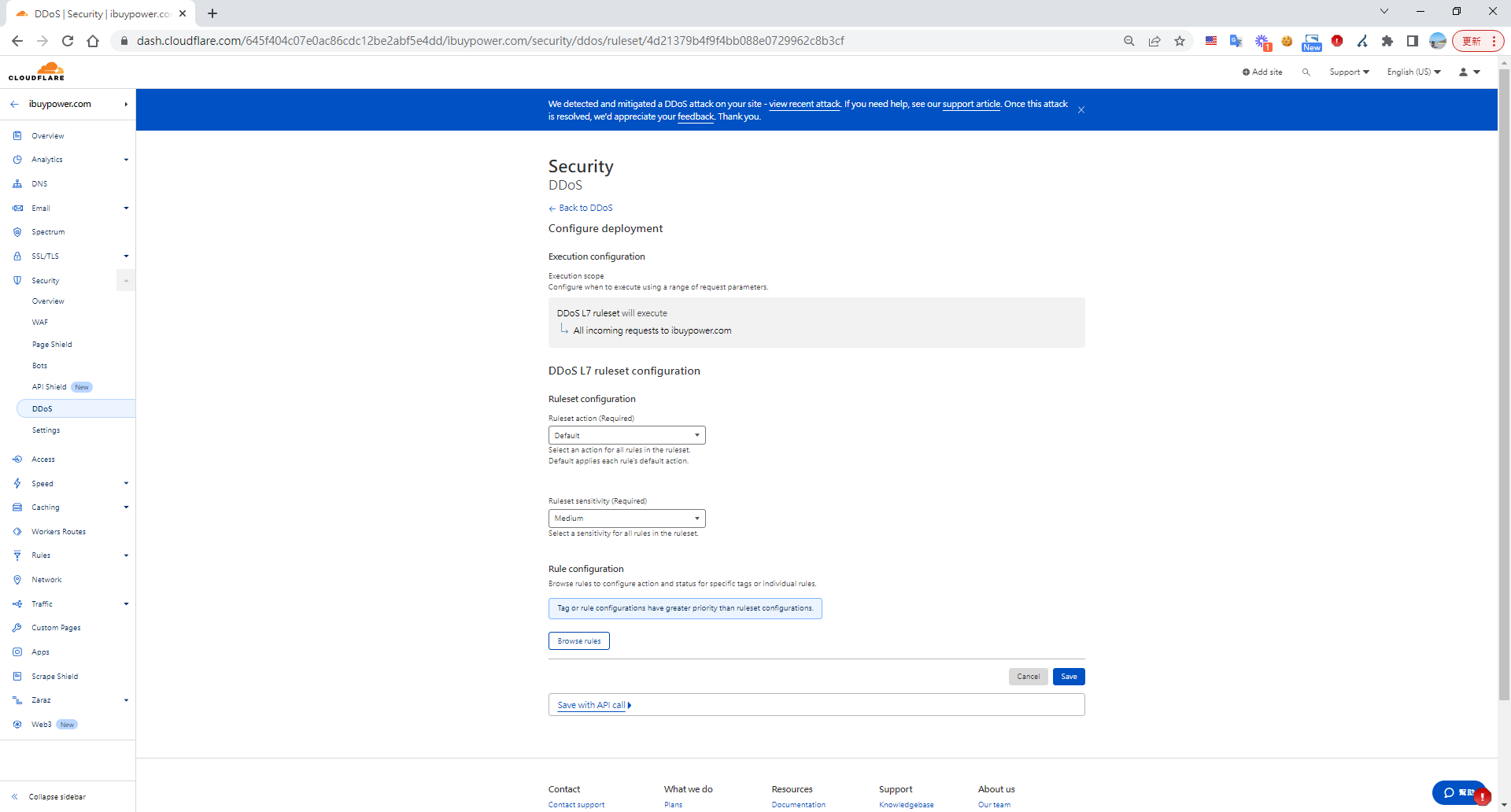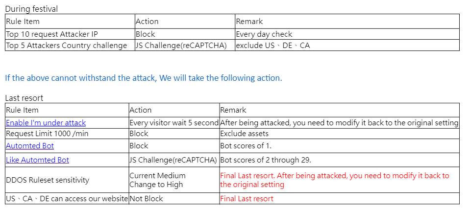 雖然我們的 Cloudflare是企業版的,看起來靠預設的設定,Cloudflare 雖然擋掉大部份的DDoS,但攻擊的量太大,仍有漏網之魚,然後我花了很多時間學習 Cloudflare,查看 Cloudflalre 所有設置,並和我的老闆討論,接著我制定了一個防止DDoS的計劃,採用 Web 應用程序防火牆規則以在黑色星期五期間保護我們的生意,並取我們得美國老闆的許可。