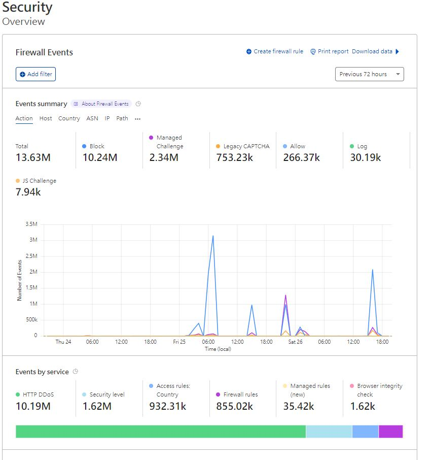 從感恩節 - 黑五檔期(三天),一共遇到 7 次 DDoS 攻擊,累積收到1300多萬惡意流量,最高一次攻擊瞬間收到300萬個請求,直到第五次攻擊後,網站跳停約30秒,從報表中發現攻擊型態轉變,從集中的 IP、 國家,從大量集中變成小量又分散的攻擊,最後決定透過 Cloudfalre 精準的械器學習結果規則做限制,在不影響生意下,除了單一 IP大量請求是直接封鎖,其他都是送他人類驗證,順利的度過今年的黑五檔期。的黑五很精彩,很多外部服務都出現異常狀況。