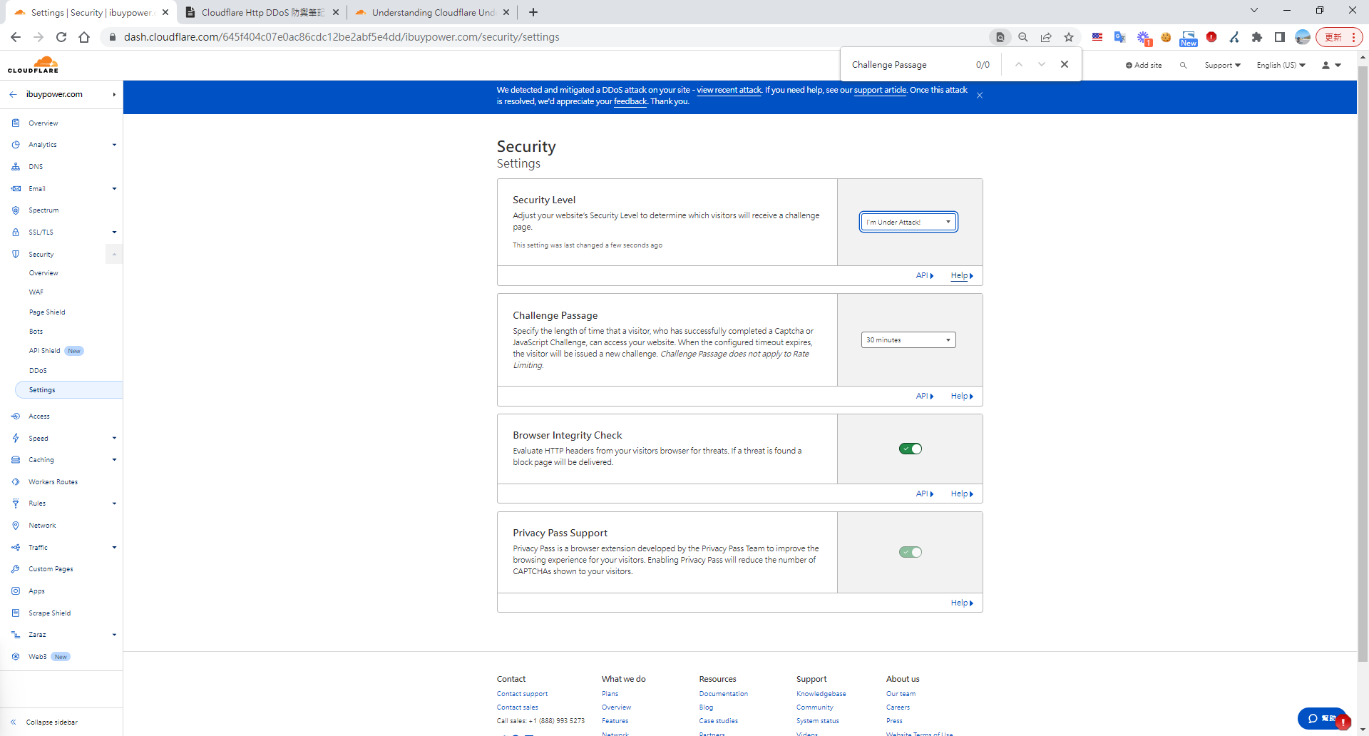 若真的都抵擋不下來,可以啟用 I’m Under Attack mode,所有的使用者都會等待五秒才能進入網站,但使用完記得調整回原設定。 Security > Settings > DDos > Configure > Security Level > Enable I’m Under Attack mode