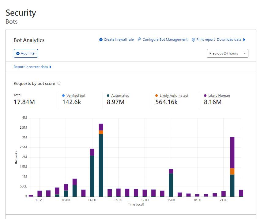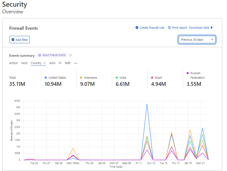 接著參考 Cloudflare 的安全報表,得知在12日,有著約 2000 萬個惡意請求發送到我們的網站。