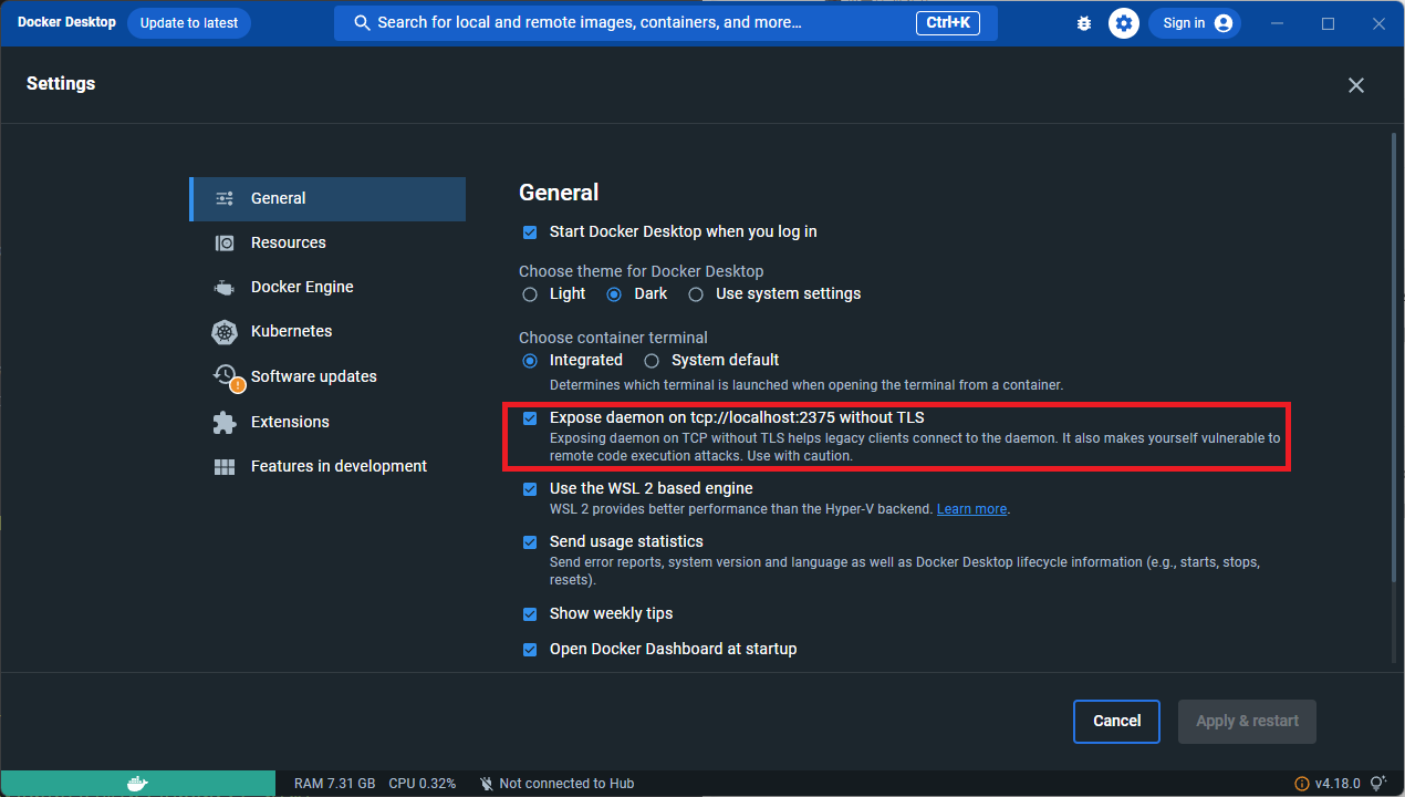 開啟Docker Desktop > 設定 > 勾選 "expose daemon on tcp://localhost:2375 without TLS remote build"